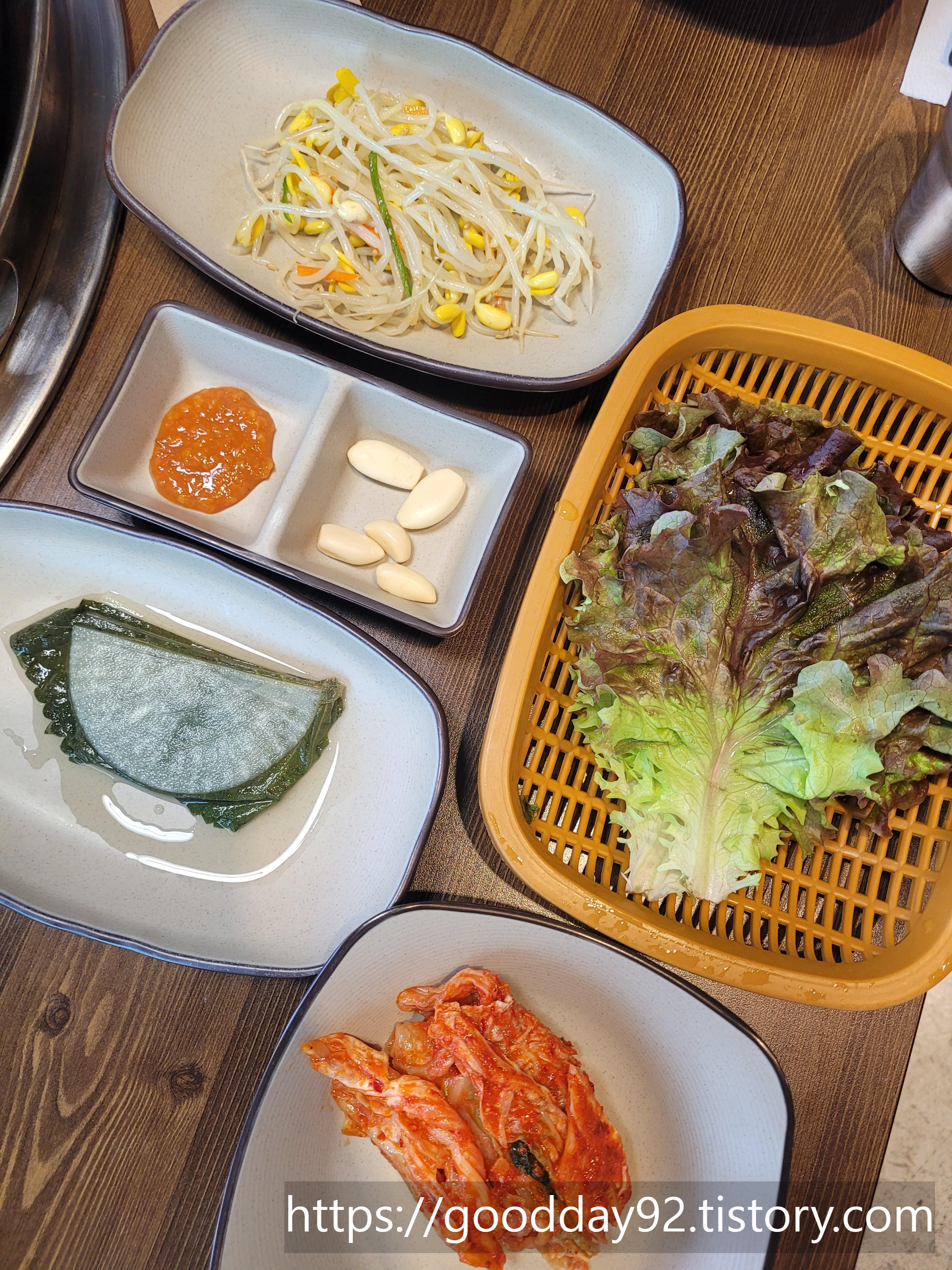 양배추, 깻잎 등 채소가 푸짐하게 올라가야 한다.